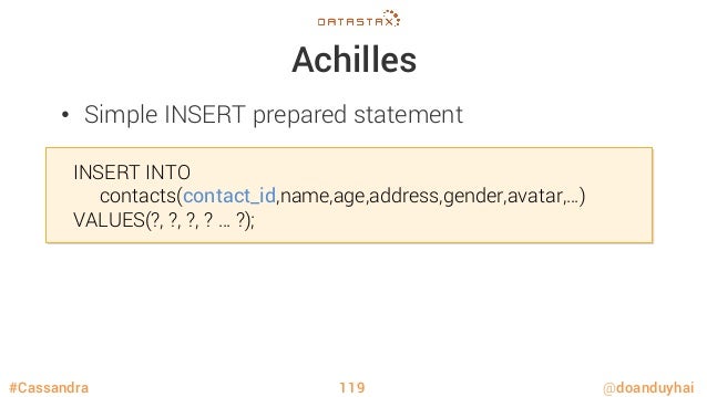 - 119. #Cassandra @doanduyhai Achilles • Simple INSERT prepared statement 119 INSERT INTO contacts(contact_id,name,age,address,gender,avatar,…) VALUES(?, ?, ?, ? … ?);