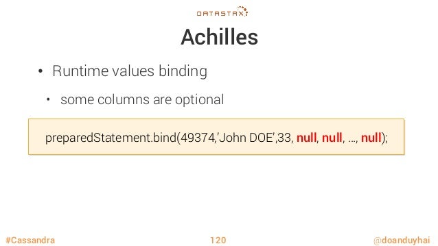 - 120. #Cassandra @doanduyhai Achilles • Runtime values binding • some columns are optional 120 preparedStatement.bind(49374,’John DOE’,33, null, null, …, null);