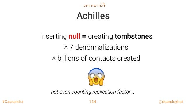 - 124. #Cassandra @doanduyhai Achilles 124 Inserting null creating tombstones × 7 denormalizations × billions of contacts created ???? not even counting replication factor …