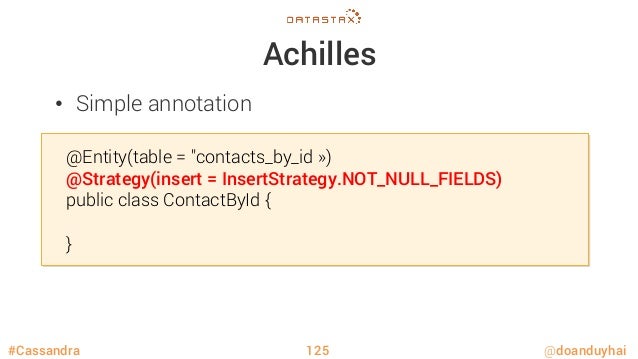 - 125. #Cassandra @doanduyhai Achilles • Simple annotation 125 @Entity(table = "contacts_by_id ») @Strategy(insert = InsertStrategy.NOT_NULL_FIELDS) public class ContactById { }