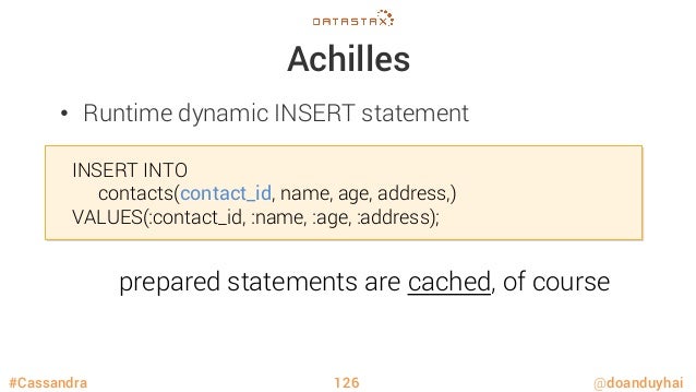 - 126. #Cassandra @doanduyhai Achilles • Runtime dynamic INSERT statement 126 INSERT INTO contacts(contact_id, name, age, address,) VALUES(:contact_id, :name, :age, :address); prepared statements are cached, of course