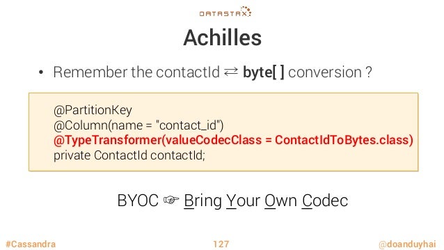 - 127. #Cassandra @doanduyhai Achilles • Remember the contactId ⇄ byte[ ] conversion ? 127 @PartitionKey @Column(name = "contact_id") @TypeTransformer(valueCodecClass = ContactIdToBytes.class) private ContactId contactId; BYOC ☞ Bring Your Own Codec