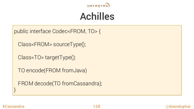 - 128. #Cassandra @doanduyhai Achilles 128 public interface Codec<FROM, TO> { Class<FROM> sourceType(); Class<TO> targetType(); TO encode(FROM fromJava) FROM decode(TO fromCassandra); }