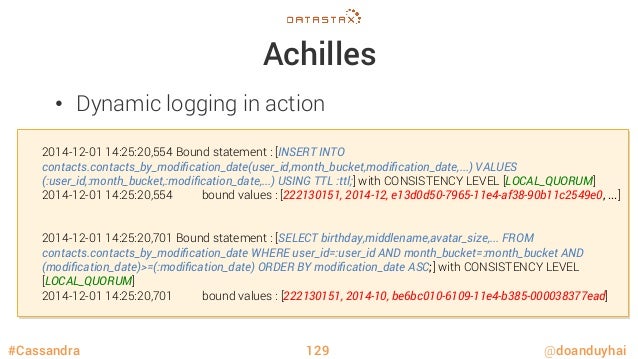 - 129. #Cassandra @doanduyhai Achilles • Dynamic logging in action 129 2014-12-01 14:25:20,554 Bound statement : [INSERT INTO contacts.contacts_by_modification_date(user_id,month_bucket,modification_date,...) VALUES (:user_id,:month_bucket,:modification_date,...) USING TTL :ttl;] with CONSISTENCY LEVEL [LOCAL_QUORUM] 2014-12-01 14:25:20,554 bound values : [222130151, 2014-12, e13d0d50-7965-11e4-af38-90b11c2549e0, ...] 2014-12-01 14:25:20,701 Bound statement : [SELECT birthday,middlename,avatar_size,... FROM contacts.contacts_by_modification_date WHERE user_id=:user_id AND month_bucket=:month_bucket AND (modification_date)>=(:modification_date) ORDER BY modification_date ASC;] with CONSISTENCY LEVEL [LOCAL_QUORUM] 2014-12-01 14:25:20,701 bound values : [222130151, 2014-10, be6bc010-6109-11e4-b385-000038377ead]