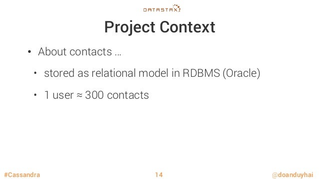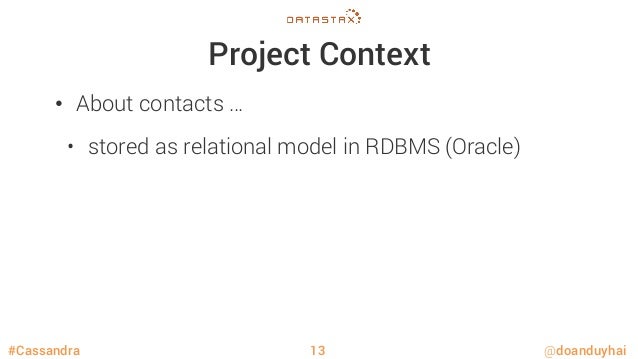 - 13. #Cassandra @doanduyhai Project Context • About contacts … • stored as relational model in RDBMS (Oracle) 13