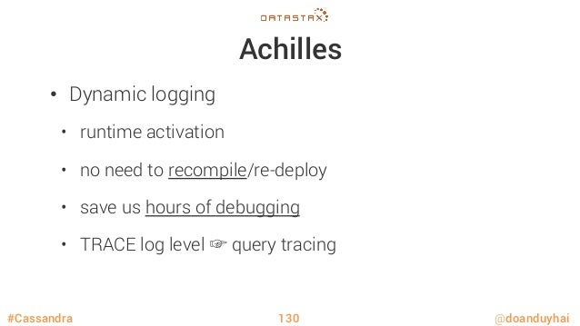 - 130. #Cassandra @doanduyhai Achilles • Dynamic logging • runtime activation • no need to recompile/re-deploy • save us hours of debugging • TRACE log level ☞ query tracing 130