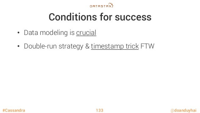 - 133. #Cassandra @doanduyhai Conditions for success • Data modeling is crucial • Double-run strategy & timestamp trick FTW 133