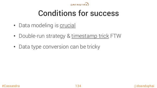 - 134. #Cassandra @doanduyhai Conditions for success • Data modeling is crucial • Double-run strategy & timestamp trick FTW • Data type conversion can be tricky 134