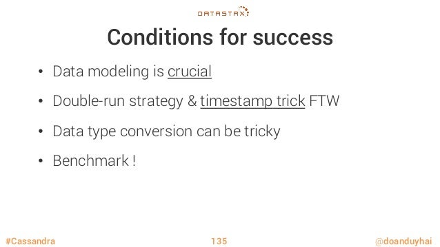 - 135. #Cassandra @doanduyhai Conditions for success • Data modeling is crucial • Double-run strategy & timestamp trick FTW • Data type conversion can be tricky • Benchmark ! 135