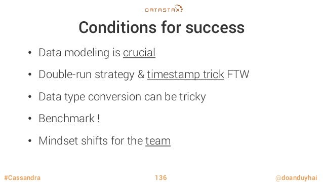 - 136. #Cassandra @doanduyhai Conditions for success • Data modeling is crucial • Double-run strategy & timestamp trick FTW • Data type conversion can be tricky • Benchmark ! • Mindset shifts for the team 136