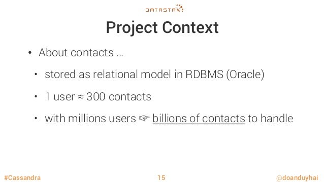 - 15. #Cassandra @doanduyhai Project Context • About contacts … • stored as relational model in RDBMS (Oracle) • 1 user ≈ 300 contacts • with millions users ☞ billions of contacts to handle 15