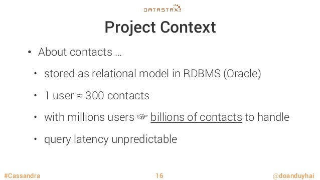 - 16. #Cassandra @doanduyhai Project Context • About contacts … • stored as relational model in RDBMS (Oracle) • 1 user ≈ 300 contacts • with millions users ☞ billions of contacts to handle • query latency unpredictable 16