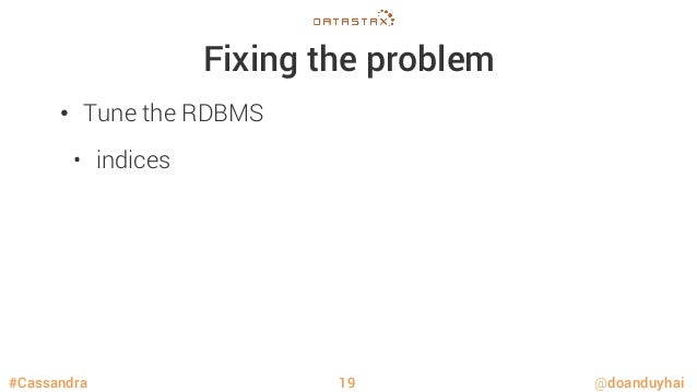 - 19. #Cassandra @doanduyhai Fixing the problem • Tune the RDBMS • indices 19