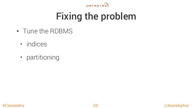 - 20. #Cassandra @doanduyhai Fixing the problem • Tune the RDBMS • indices • partitioning 20