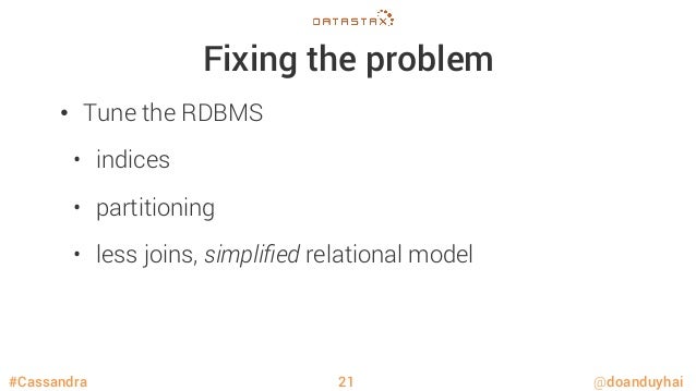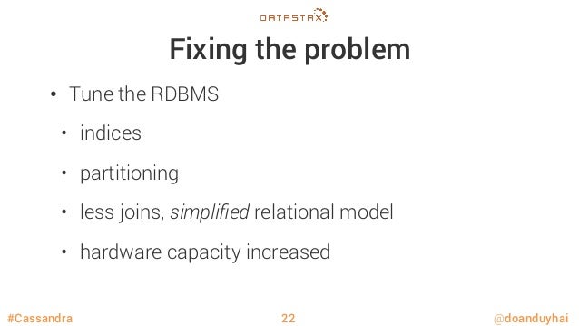 - 21. #Cassandra @doanduyhai Fixing the problem • Tune the RDBMS • indices • partitioning • less joins, simplified relational model 21