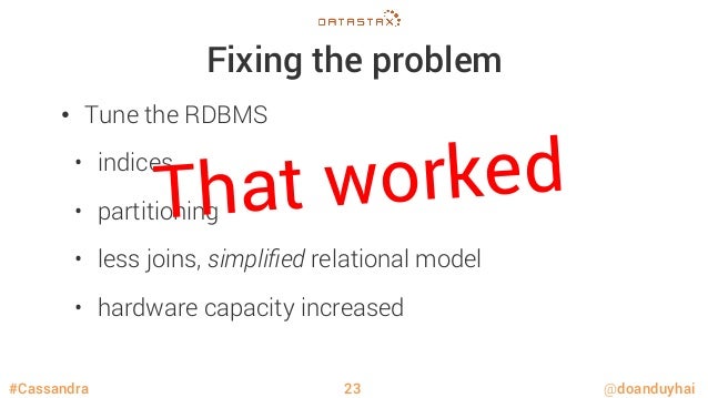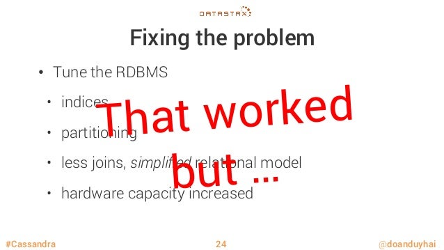 - 23. #Cassandra @doanduyhai Fixing the problem • Tune the RDBMS • indices • partitioning • less joins, simplified relational model • hardware capacity increased 23 That worked
