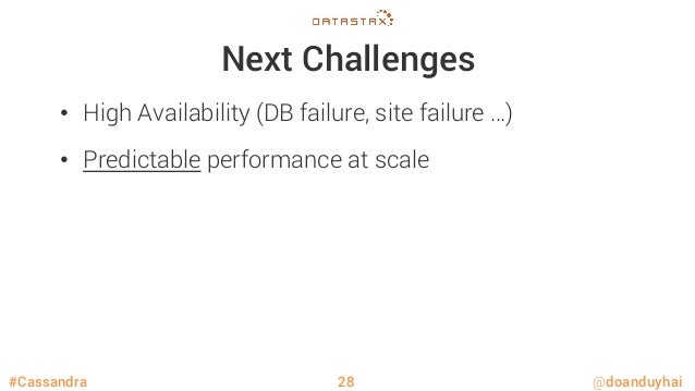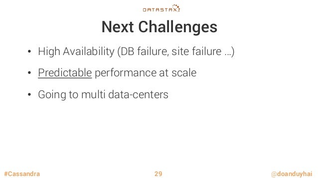 - 28. #Cassandra @doanduyhai Next Challenges • High Availability (DB failure, site failure …) • Predictable performance at scale 28