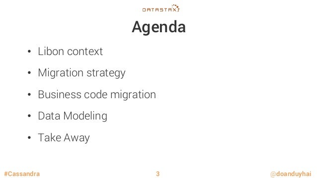 - 3. #Cassandra @doanduyhai Agenda • Libon context • Migration strategy • Business code migration • Data Modeling • Take Away 3