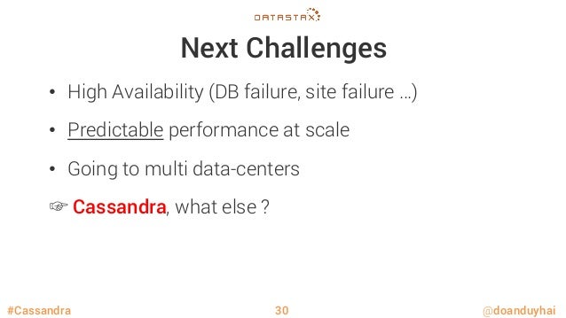 - 30. #Cassandra @doanduyhai Next Challenges • High Availability (DB failure, site failure …) • Predictable performance at scale • Going to multi data-centers ☞ Cassandra, what else ? 30