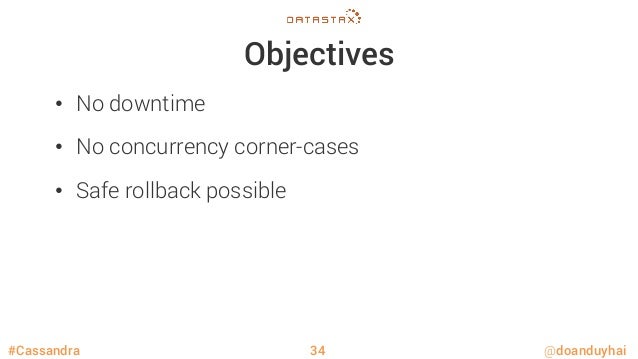 - 34. #Cassandra @doanduyhai Objectives • No downtime • No concurrency corner-cases • Safe rollback possible 34