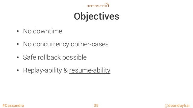 - 35. #Cassandra @doanduyhai Objectives • No downtime • No concurrency corner-cases • Safe rollback possible • Replay-ability & resume-ability 35