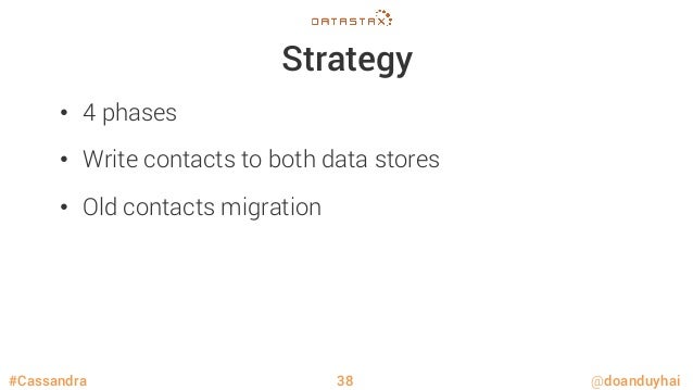 - 38. #Cassandra @doanduyhai Strategy • 4 phases • Write contacts to both data stores • Old contacts migration 38