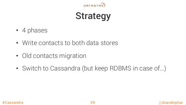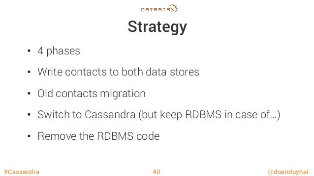 - 40. #Cassandra @doanduyhai Strategy • 4 phases • Write contacts to both data stores • Old contacts migration • Switch to Cassandra (but keep RDBMS in case of…) • Remove the RDBMS code 40