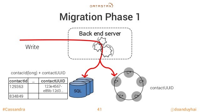 - 41. #Cassandra @doanduyhai Migration Phase 1 41 Back end server · · · SQLSQLSQL C* C* C* C* C* Write contactUUID contactId … contactUUID 129363 123e4567- e89b-12d3… 834849 contacId(long) + contactUUID