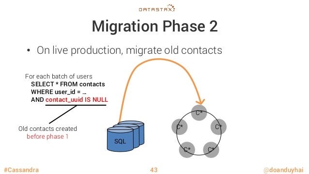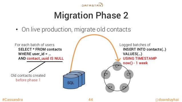 - 44. #Cassandra @doanduyhai Migration Phase 2 • On live production, migrate old contacts 44 SQLSQLSQL C* C* C* C* C* For each batch of users SELECT * FROM contacts WHERE user_id = … AND contact_uuid IS NULL Logged batches of INSERT INTO contacts(..) VALUES(…) USING TIMESTAMP now() - 1 week Old contacts created before phase 1