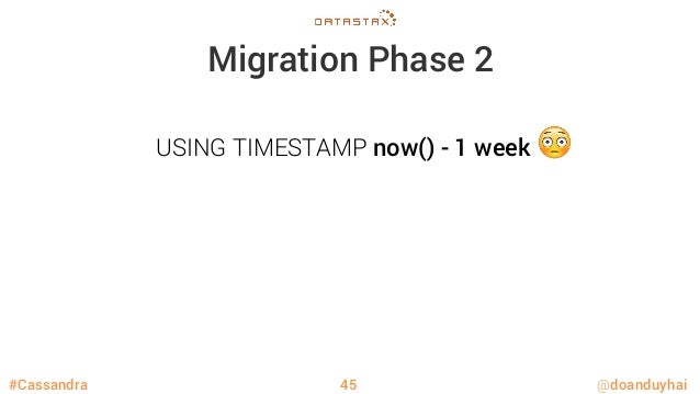 - 45. #Cassandra @doanduyhai Migration Phase 2 45 USING TIMESTAMP now() - 1 week ????