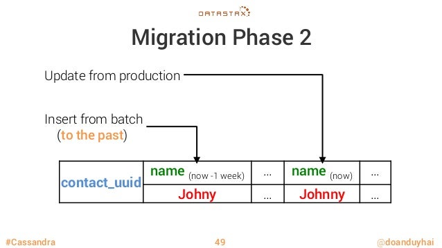 - 49. #Cassandra @doanduyhai Migration Phase 2 49 contact_uuid name (now -1 week) … name (now) … Johny … Johnny … Insert from batch (to the past) Update from production