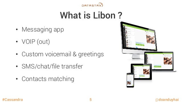 - 5. #Cassandra @doanduyhai What is Libon ? • Messaging app • VOIP (out) • Custom voicemail & greetings • SMS/chat/file transfer • Contacts matching 5