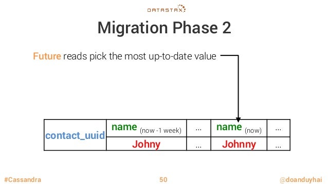- 50. #Cassandra @doanduyhai Migration Phase 2 50 contact_uuid name (now -1 week) … name (now) … Johny … Johnny … Future reads pick the most up-to-date value