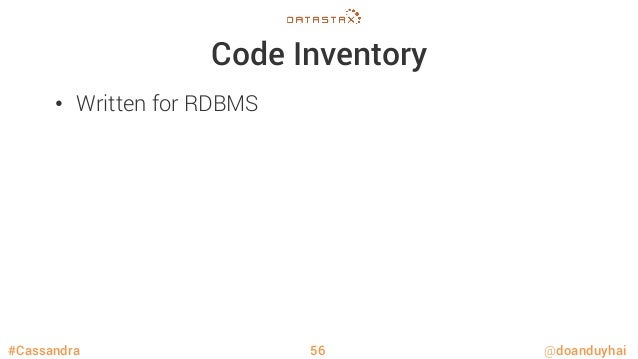 - 56. #Cassandra @doanduyhai Code Inventory • Written for RDBMS 56