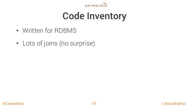 - 57. #Cassandra @doanduyhai Code Inventory • Written for RDBMS • Lots of joins (no surprise) 57