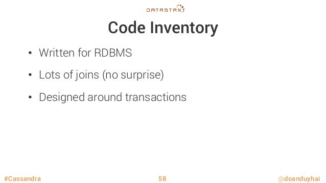 - 58. #Cassandra @doanduyhai Code Inventory • Written for RDBMS • Lots of joins (no surprise) • Designed around transactions 58