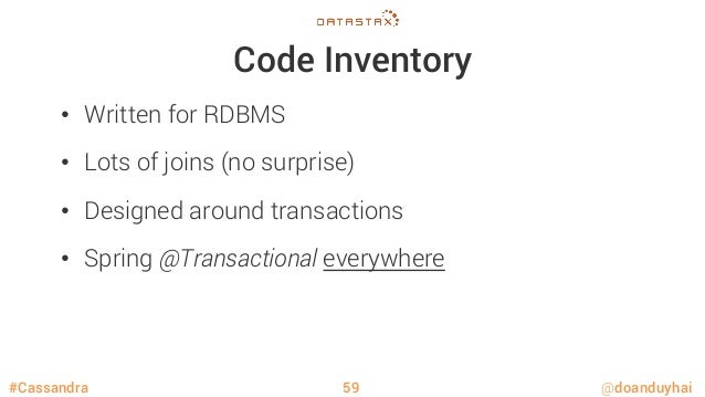 - 59. #Cassandra @doanduyhai Code Inventory • Written for RDBMS • Lots of joins (no surprise) • Designed around transactions • Spring @Transactional everywhere 59