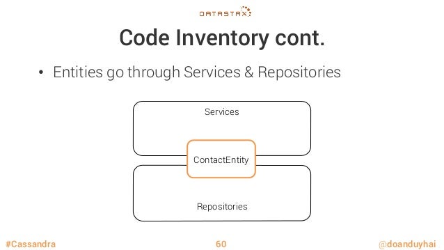 - 60. #Cassandra @doanduyhai Code Inventory cont. • Entities go through Services & Repositories 60 Repositories Services ContactEntity