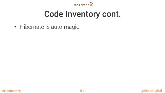 - 61. #Cassandra @doanduyhai Code Inventory cont. • Hibernate is auto-magic 61