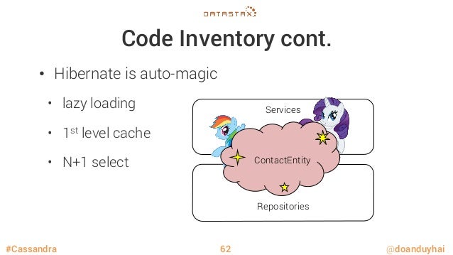 - 62. #Cassandra @doanduyhai Code Inventory cont. • Hibernate is auto-magic • lazy loading • 1st level cache • N+1 select 62 Repositories Services ContactEntity