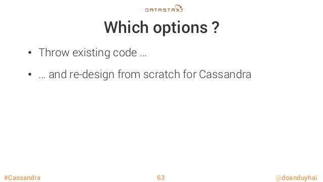 - 63. #Cassandra @doanduyhai Which options ? • Throw existing code … • … and re-design from scratch for Cassandra 63