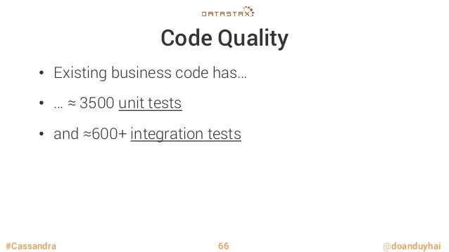 - 66. #Cassandra @doanduyhai Code Quality • Existing business code has… • … ≈ 3500 unit tests • and ≈600+ integration tests 66
