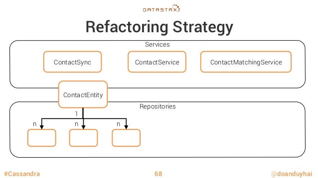 - 68. #Cassandra @doanduyhai Repositories Services Refactoring Strategy 68 ContactMatchingService ContactService ContactSync ContactEntity n 1 n n
