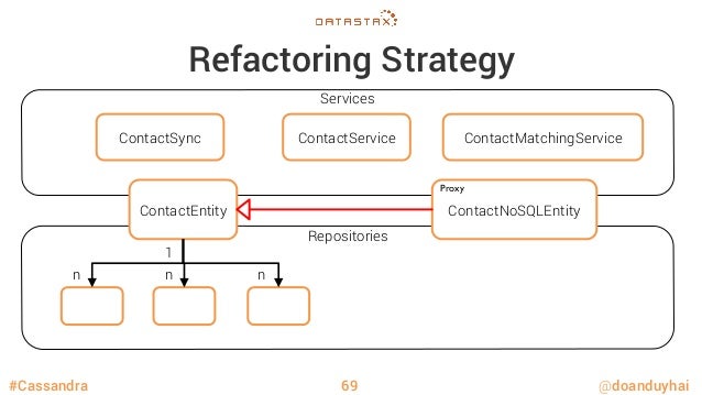 - 69. #Cassandra @doanduyhai Repositories Services Refactoring Strategy 69 ContactMatchingService ContactService ContactNoSQLEntity ContactSync ContactEntity n 1 n n Proxy