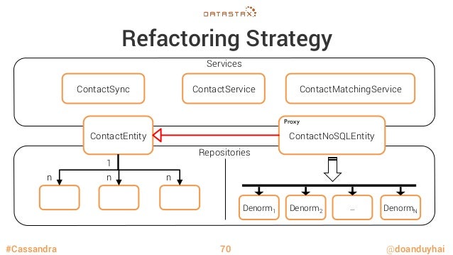 - 70. #Cassandra @doanduyhai Repositories Services Refactoring Strategy 70 ContactMatchingService ContactService ContactNoSQLEntity ContactSync ContactEntity n 1 n n Denorm2 … DenormN Denorm1 Proxy