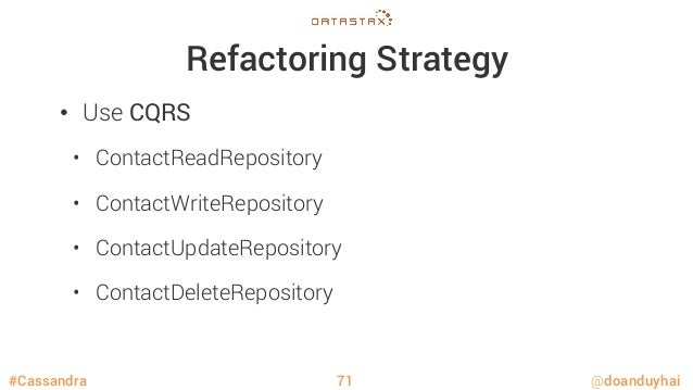 - 71. #Cassandra @doanduyhai Refactoring Strategy • Use CQRS • ContactReadRepository • ContactWriteRepository • ContactUpdateRepository • ContactDeleteRepository 71