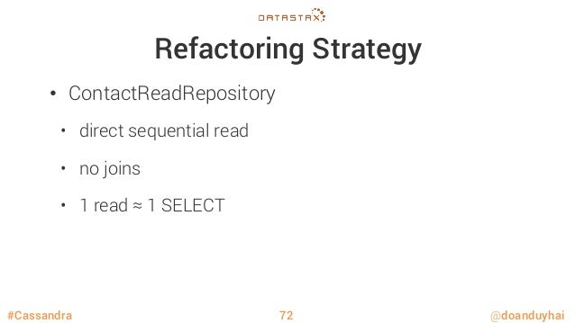 - 72. #Cassandra @doanduyhai Refactoring Strategy • ContactReadRepository • direct sequential read • no joins • 1 read ≈ 1 SELECT 72