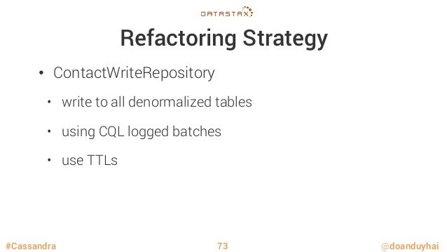 - 73. #Cassandra @doanduyhai Refactoring Strategy • ContactWriteRepository • write to all denormalized tables • using CQL logged batches • use TTLs 73