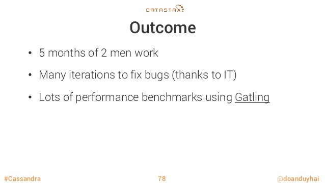 - 78. #Cassandra @doanduyhai Outcome • 5 months of 2 men work • Many iterations to fix bugs (thanks to IT) • Lots of performance benchmarks using Gatling 78