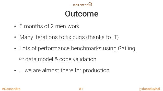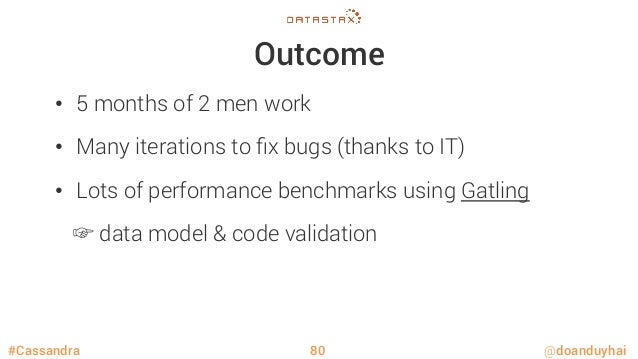 - 80. #Cassandra @doanduyhai Outcome • 5 months of 2 men work • Many iterations to fix bugs (thanks to IT) • Lots of performance benchmarks using Gatling ☞ data model & code validation 80